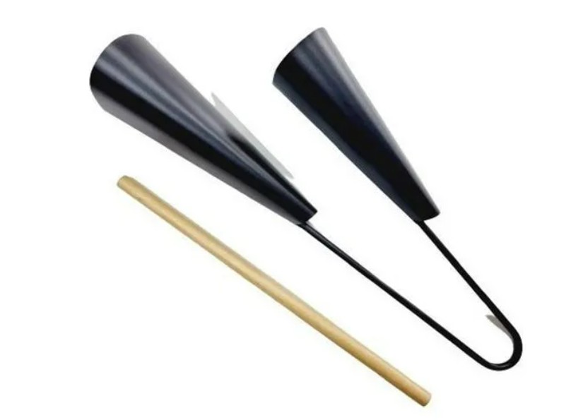 Agogô marca STRATUS de campana dupla de metal, com baqueta de madeira.