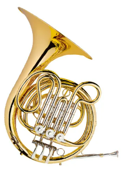 Trompa Regency, afinação em fá; 3 rotores; acabamento laqueado; com detalhes em cuproníquel; campana 305mm; calibre 11,50mm, com bocal e estojo de luxo.